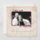 La invitación incluye textura de papel pergamino con líneas color rojo violeta que bordean un marco alrededor de la fotografía de compromiso con texto que dice "tener y mantener" en un lado con los detalles de su boda en el otro con un borde naranja alrededor de los bordes de la invitación.