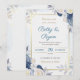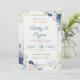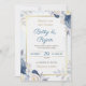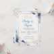 Un marco de marfil atemporal adornado con flores azules suaves y elegantes acentos dorados, esta invitación a la boda presenta un hermoso diseño y una hermosa decoración floral. Las delicadas flores azules se complementan con sutiles detalles dorados, creando un ambiente sofisticado y romántico. Ideal para parejas que buscan una mezcla de encanto clásico y elegancia moderna para su día especial.