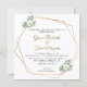 Una bella y elegante invitación a la boda. Con un marco geométrico dorado y elementos florales y verdes, esta invitación tiene un diseño impresionante que impresiona a tus amigos y familiares.