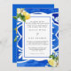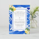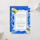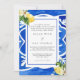 Lemones acuarelas. Baldosa mediterránea. Invitación a la boda. Floral de elementos florales mediterráneos en la parte posterior. Marco azul.
