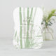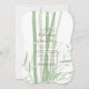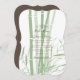 Este diseño presenta elegantes brotes de bambú verde. El fondo de la vegetación de bambú da paso a la tipografía de la redacción marrón. El bambú se esconde creando un tono diferente de verde que le da dimensión. El reverso del diseño se centra en representar el color marrón de la redacción y los nombres de la novia y del novio están en el color verde bambú. Elegante diseño de invitación a bodas asiáticas con elementos modernos. También están disponibles artículos de papelería para bodas y otros formatos de invitación para bodas.