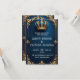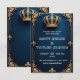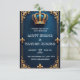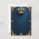 Elegante patrón de invitación a la boda al estilo real con una corona dorada de diseño intrincado adornada con preciosas joyas en la parte superior, ambientada con un rico fondo azul oscuro con texturas sutiles de terciopelo, rodeada de motivos ornamentales inspirados en el castillo, como torres, arcos y flor de lis de azulejos dorados, con un toque de cremoso blanco para evocar el lujo y la sofisticación, amplio espacio para detalles bodas personalizados en una fuente refinada y serif con un sutil contorno dorado, y un sutil borde dorado para completar el aspecto regal, perfecto para una majestuosa y opulenta celebración boda.
