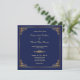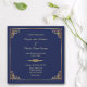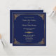 Sencillo, pero con una elegancia impresionante es esta clásica invitación formal a la boda con marco de oro y azul real. Presenta el texto de su personalizado en oro pálido dentro de un marco dorado delgado con esquinas geométricas ornamentadas. Un divisor de oro que coincida separa el texto superior de la parte inferior. Todo está colocado sobre un fondo azul real. La parte posterior de la invitación repite el divisor cerca de la parte inferior, con otro campo de texto debajo. Puede dejarlo como está, cambiarlo o eliminarlo completamente limpiando el campo. ¡Depende de ti! Clásica e intemporal belleza. Asegúrese de comprobar todas las opciones de papel disponibles para hacer de esta invitación un diseño verdaderamente único.