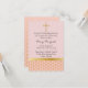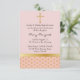 Elegante invitación a la cristalización de una bebé hecha en rosa coral claro, con un patrón oro y rosa coral, en el fondo. Gráficos de una cruz de oro y cinta dorada decoran esta encantadora invitación. El texto negro está listo para personalizar para leer lo que quieras. Encantadora invitación.