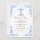 Comience bien su evento con nuestro elegante marco azul antiguo con delicadas floridas flores, con una cruz azul sobre un fondo blanco. Bebé bautismo / invitación a bautizar. Fácil de personalizar, sólo tienes que añadir la información del evento y estás listo para ir.