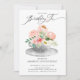 Hermoso ramo rosa de flores en una taza de té gris sobre un fondo gris para un fiesta de té de cumpleaños. Haga girar nuestra invitación para ver una parte posterior de la floral para obtener un toque especial.