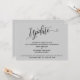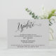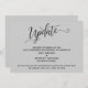 La distinción de esta suite se debe a la elaborada y giratoria fuente de escritura utilizada para las frases de acento. En caso de que necesite informar a sus huéspedes de que su boda ha sido pospuesto, esta tarjeta le ofrece una opción elegante y sencilla. En esta pieza, el tipo de letra de caligrafía se utilizó para crear un gráfico que representa la palabra "Actualizar". Utilice los campos de plantilla para agregar sus datos personales y hacer que este diseño sea el suyo. El fondo puede cambiarse a cualquier color que prefiera. Por favor, contacte con cualquier solicitud especial o para personalizar la asistencia. // 98 //