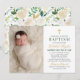 Esta elegante invitación de bautizo o presentación para niña presenta una foto personalizable del bebé junto a un texto elegante en verde, dorado y negro suave acentuado con una cruz dorada. Todo el texto se puede personalizar completamente para su evento. Un hermoso patrón floral coordinado de flores de rosa blancas, crema y rubor con follaje verde y dorado adorna la parte posterior de la tarjeta.