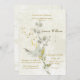 Celebre un momento sagrado con esta elegante tarjeta de bautizo que presenta una suave paloma blanca rodeada de elementos botánicos dorados y plateados sobre un fondo texturizado cremoso.