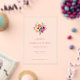 Esta elegante invitación de boda presenta un arreglo floral bellamente ilustrado en suaves tonos pastel de melocotón, rosa y amarillo, sobre un fondo limpio y claro. El diseño emplea un estilo minimalista moderno con un amplio espaciado entre las líneas de texto, que se presentan en una fuente clásica serif para dar un toque sofisticado. Los elementos decorativos incluyen puntos sutiles que separan las secciones, mejorando la composición general. Perfecta para parejas que buscan un aspecto refinado y contemporáneo, esta invitación marca el tono para una celebración inolvidable.