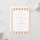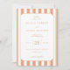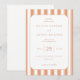 Esta elegante invitación de boda presenta un diseño clásico con bordes verticales a rayas melocotón y blanco que enmarcan un panel central de color crema. La disposición es limpia y sofisticada, utilizando una mezcla de fuentes serif negrita para los nombres y la fecha, complementada con delicada escritura cursiva para añadir encanto. La paleta de colores cálidos y la tipografía refinada crean una atmósfera acogedora, perfecta para celebrar una unión especial. Los elementos personalizables permiten la personalización de nombres, fechas y ubicación, lo que la hace ideal para parejas que buscan un look atemporal y formal para su gran día.