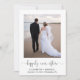 Elegante y chic anuncio de boda íntima o pequeña boda e invitación a la recepción o fiesta posterior a la boda. La parte delantera presenta su fotografía, "felices para siempre" escrito en una elegante letra con florituras y sus nombres, fecha y lugar de la boda. En el reverso, puede personalizar su anuncio de boda con más detalle, agregar una invitación a la recepción o fiesta y firmar sus apellidos de casados en una letra con estilo de firma.