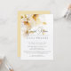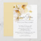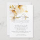 Elegante invitación romántica rústica de boda con flores blancas y doradas en acuarela.