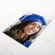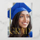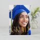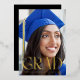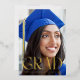 Tipo de letra de estilo moderno de las letras "Grad" con foto de sangría completa. Elige tu color de Relieve metalizado, oro, plata o oro rosa. Retrovisor de fotos opcional. Agregue los detalles de un evento al reverso, o planes futuros, o más fotos como desee.