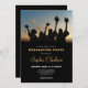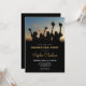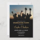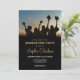 Una invitación a graduarse con un diseño elegante con graduados tirando sus gorras al aire.