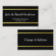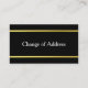Un fondo negro está en esta tarjeta de dirección. Una línea de oro falsa (no Relieve metalizado) está encima y debajo del texto. Personaliza tus tarjetas con tu nombre y dirección. El otro lado dice 'Cambio de dirección'.