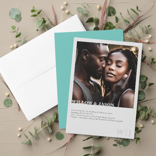 Celebra tu día especial con nuestra elegante invitación a la boda minimalista. Con un sofisticado fondo casi blanco-gris, esta invitación muestra tu foto favorita en primer plano, maravillosamente personalizada con tus nombres que se superponen elegantemente en el fondo de la imagen. Debajo de la foto, encontrará todos los detalles esenciales del boda cuidadosamente presentados. Sus iniciales están colocadas sutilmente en la parte inferior derecha para un toque personal adicional. La parte trasera de la invitación es un impresionante verde azulado a acentuar el papel, con las iniciales cuidadosamente impresas en el centro. Este elegante diseño combina a la perfección la sencillez y la elegancia, lo que lo convierte en una elección ideal para los bodas modernos.