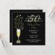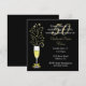 Invitación chic para fiesta de bodas de oro número cincuenta, realizada en negro y dorado. Gráficos de una copa de champán festiva decorada con un lazo dorado en el tallo y destellos que salen de la parte superior, adornan el lado izquierdo de la invitación negra. El texto en blanco y dorado es totalmente personalizable para adaptarse a las necesidades de su evento.