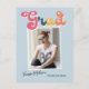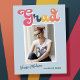 Foto retro de moda, postales de invitación de graduación, con elementos de diseño de tipografía de estilo vintage que dicen "Grad" en colores boho del arcoiris. La foto de los graduados se destaca con finas fronteras blancas. Color de fondo azul cielo claro o editar y cambiar el color fácilmente según sea necesario. La parte posterior de la tarjeta ofrece espacios de texto personalizados para obtener información sobre su graduación. Perfecto para el bachillerato, la universidad y la universidad.