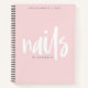 Elegante libreta de citas para tu negocio de las uñas. El diseño presenta el guión tipográfico ''uñas'' en blanco sobre un fondo rosa pálido. Personaliza tus datos y los medios sociales en la espalda.