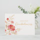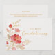 Diseño de tarjeta de condolencias con efecto floral rojo claro y dorado en la esquina.