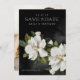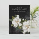Un elegante Save the Date diseñado con un ilustracion Magnolia Blanco sobre un fondo negro. La parte posterior de esta tarjeta se puede personalizar con tu foto favorita orientada a retratos.