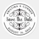 Una ronda personalizado guarda la etiqueta pegatina de fecha adornada con un emblema decorativo de trabajo de desplazamiento. Inserte sus nombres y fecha en lugar del texto de ejemplo que se muestra en la plantilla de diseño. Diseñado para ti por Blackberry Boulevard.