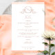 Bienvenido a su mesa con este elegante menú boda monogramado, con un exquisito monograma a mano con iniciales de parejas y rayas de color melocotón. De vuelta con un hermoso lavado acuático en una variedad de melocotón, crema, coral y polvorientos tonos naranjas. Parte de nuestra colección "Peach Watercolor Botanical Monogram Boda" con una variedad de productos de coordinación disponibles, incluyendo el programa de bienvenida boda, número de tabla y tarjetas de cartas de asignación. Visita toda la colección con este enlace: https://www.zazzle.com/collections/peach_watercolor_botanical_monogram_wedding-119201759263203074
