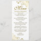 Este bonito menú presenta un bonito diseño con un texto dorado sobre un fondo blanco clásico y unos rizos de Relieve metalizado dorados falsos y unos remolinos en las esquinas. Hay elegantes letras de guión para el título y espacio para los nombres de la pareja y la fecha boda. Diseñado con el producto estándar de tarjetas de felicitación de Zazzle, este menú está disponible para descarga digital, lo que lo convierte en la elección perfecta para pedidos de última hora. ¡Una forma maravillosa de añadir un poco de estilo y clase a tu recepción de bodas!