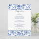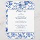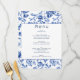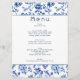 Elevar la recepción de bodas con este elegante menú de temática botánica, diseñado para complementar una celebración clásica y atemporal. El sofisticado borde floral de un azul profundo enmarca el texto central, ofreciendo una presentación elegante y refinada para sus huéspedes. Con un diseño de fondo de inspiración blanca y vintage aporta un toque de encanto de lo antiguo a su celebración moderna. Perfecto para añadir una capa extra de belleza a su mesa, este menú guía a sus huéspedes a través de los deliciosos cursos planeados para su gran día. Ideal para parejas que buscan una estética elegante y tradicional para su boda.