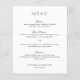 Elegante menú boda en blanco y negro con un diseño sencillo y minimalista con el título en una fuente serif tradicional y los encabezados de los cursos en un elegante guión caligráfico. Un estilo clásico perfecto para un boda formal.