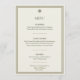Rellene su tablescape de recepción con esta tarjeta de menú Boda de Marfil & Oro Green Border 5x7, que forma parte de la elegante colección de Bodas de Marfil & Oro Green Border. Con un fondo de marfil intemporal enmarcado con un borde doble dorado y verde y acentuado por un sutil motivo de palmera, esta carta añade sofisticación y cohesión a su suite de papelería boda. Diseñada con una tipografía limpia y un formato amplio, esta tarjeta de menú le permite presentar deliciosamente entrantes, platos principales y postres. Perfecto para recepciones de lujo en el salón de baile, bodas de destino tropical, celebraciones en el jardín y eventos en el complejo turístico, combina el estilo clásico con el refinamiento moderno. Personalice el menú, los nombres y la fecha de su boda para crear un conservador que los huéspedes apreciarán. El tamaño 5x7 combina perfectamente con invitaciones, tarjetas de detalles, programas, tarjetas de agradecimiento y tarjetas de colocación de la colección, lo que garantiza una estética boda coordinada y elevada. Disponible en opciones de diseño cuadrado y 5x7 para un estilo versátil. Parte de la colección de Bodas de la Frontera Verde Marfil & Oro - mezcla y combina con invitaciones, tarjetas RSVP, tarjetas de detalles, programas de boda, tarjetas de agradecimiento y más para una suite de papel coherente y elegante.