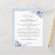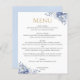Añada un toque de sofisticación a sus mesas de recepción con esta elegante carta de menú de bodas, con suaves flores de color azul en polvo y delicados acentos dorados. Perfecto para los bodas románticos, de jardín o clásicos, este menú se coordina con la colección completa de Bodas Powder Blue & Gold.