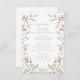 Mejore su eterna celebración boda con una elegante carta de menú temático botánico. Mostrando una cortina acuarela de flores de pradera pastel y hojas de eucalipto de vegetación. Este refinado diseño se complementa con un toque personalizado: el micrograma de novias y novios en la parte trasera, creando un elemento memorable y distintivo para su celebración especial de primavera/verano en el jardín exterior.