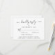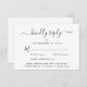 Elegante tarjeta RSVP de bodas con "amablemente respuesta" en un guión elegante con toques, tipografía simple y moderna, opciones personalizadas de entrada de menú y sus nombres unidos por un corazón en la parte trasera.