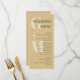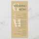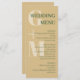 Elegante menú boda de tipografía en color tostado con sus iniciales en letras grandes en el lateral del menú. Agregue su menú en texto verde. Menú boda monogramado en beige con sus iniciales. Menú boda de tipografía en verde y bronceado.