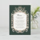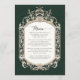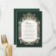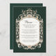 RICO EMERALD, BOSQUE VERDE CON ORO, MENÚ DE CENA FORMAL PARA LA RECEPCIÓN DE BODAS O DUCHA BRIDAL. Aspecto clásico y ostensiblemente ornamentado, dorado y dimensional, marco barroco victoriano de rococo sobre un elegante patrón vintage de damasco tono en tono de cazador negro verde que fue diseñado gráficamente por la artista con licencia internacional, Audrey Jeanne Roberts ©
