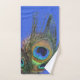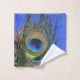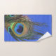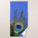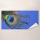 Gran pluma de pavo real en tonos verdes azules sobre fondo azul real, acento más eficaz en la decoración moderna de la casa. El pavo real es un símbolo de belleza, renacimiento y riqueza.