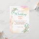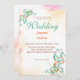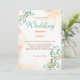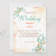 El diseño presenta salpicaduras de color naranja claro y flecks simulados. El diseño también contiene ramas de eucalipto y otros elementos naranjas claros en tonos de naranja oscuro, y más para adaptarse a todas las temporadas en las que puede caer su boda y colores que complementan el color de color. La parte de atrás de la invitación tiene un hermoso monograma de novia y novio.