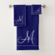 Juego de toallas de baño azul marino monograma inicial con guión lilac pálido elegante personalizado. Refresca la decoración del baño con un estilo tipográfico minimalista.