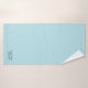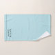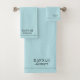 Elegante monogramo personalizado serif blanco nombre y guión apellido, toalla de baño set borde blanco sobre el polvo azul. Refresca la decoración del baño con un estilo tipográfico minimalista.