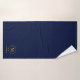 Este juego de toallas personalizado es sencillo, sofisticado y elegante. Presenta un fondo azul marino con un delicado monograma de corona botánica dorada y tipografía de escritura dorada para su personalización.