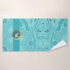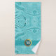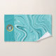 Una elegante toalla de baño turquesa con un patrón abstracto de mármol fluido y un monograma blanco sobre un círculo verde azulado dorado listo para su personalización. Estas toallas son de moda y de diseño para complementar la decoración actual.