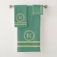 Este elegante juego de toallas de baño es único gracias al Monograma de tres colores, mire con atención y verá el detalle, que queda cuando cambie a su inicial. Elegante y suave verde con una moderna toalla de baño de moda con borde dorado puede añadir una elegancia clásica a su cuarto de baño. Simplemente haga clic en "personalizar" e introduzca su monograma / inicial y hágalo suyo. Vea también una alfombra de baño y cortina de ducha a juego.