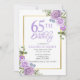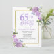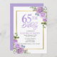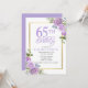 Celebre un hito con esta hermosa plantilla de invitación para el cumpleaños 65 que presenta elegantes acentos florales violetas y un diseño inspirado en el purpurina. Perfecto para crear una celebración personalizada, invita a amigos y familiares. Los campos de texto fácilmente modificables le permiten realizar personalizares de todos los detalles, incluidos el nombre, la fecha, la hora, la ubicación y la información de RSVP. Diseñado con un sofisticado marco dorado y vibrantes flores de lavanda, esta invitación es ideal para honrar el día especial de su ser querido con estilo.