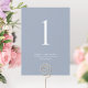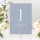 Ayude a sus huéspedes a encontrar su mesa con este elegante y moderno número de mesa. Las tarjetas de doble cara en funda le gusta usarlas en marcos claros o en soportes de tabla que se pueden ver desde delante y hacia atrás. Color del fondo azul turbio con texto en blanco. NOTA: añada un pedido individual para cada número de tabla (es decir, para un evento con tres tablas, tendría que colocar y ordenar con la tabla número uno, añadir al carro de la compra, volver a añadir número dos para la tabla dos, añadir al carrito de la compra, volver y añadir número 3 para la tabla número tres, añadir al carrito de la compra, y ahora el pedido se completa con el pago). Parte de nuestra colección "Elegant Bliss" con una variedad de productos de coordinación disponibles como tarjetas de cartas de asientos.