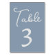Esta elegante tarjeta personalizado de números de mesa presenta un diseño sencillo y moderno. El número de tabla se imprime en una fuente de script sobre un fondo polvoriento de color azul.