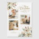 Elegante y único diseño floral de 3 fotos de vacaciones con ramos de esquina de poinsettia blanca a la acuarela, holly y pino con chispas doradas. Incluye el saludo de Feliz Navidad en escritura decorativa y un campo de texto editable.