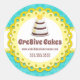 © 2021 Socialite Designs. Elegante diseño pegatina de panadería de pasteles que incorpora un fondo de damasco turquesa, banner de borde de vieiras amarillas para tu texto, y un diseño de pasteles personalizados con detalles botánicos y giratorios.