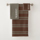 Conjunto de toallas de baño con elegante patrón de rayas marrones y grises con nombre personalizado.